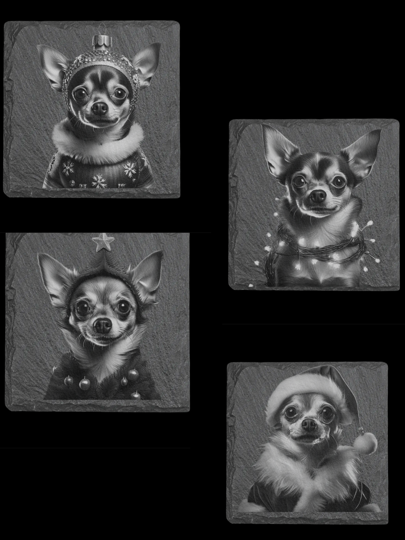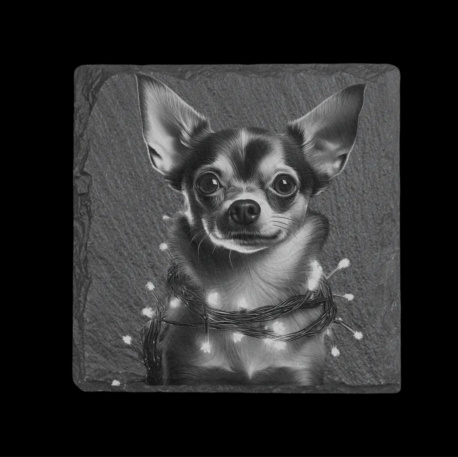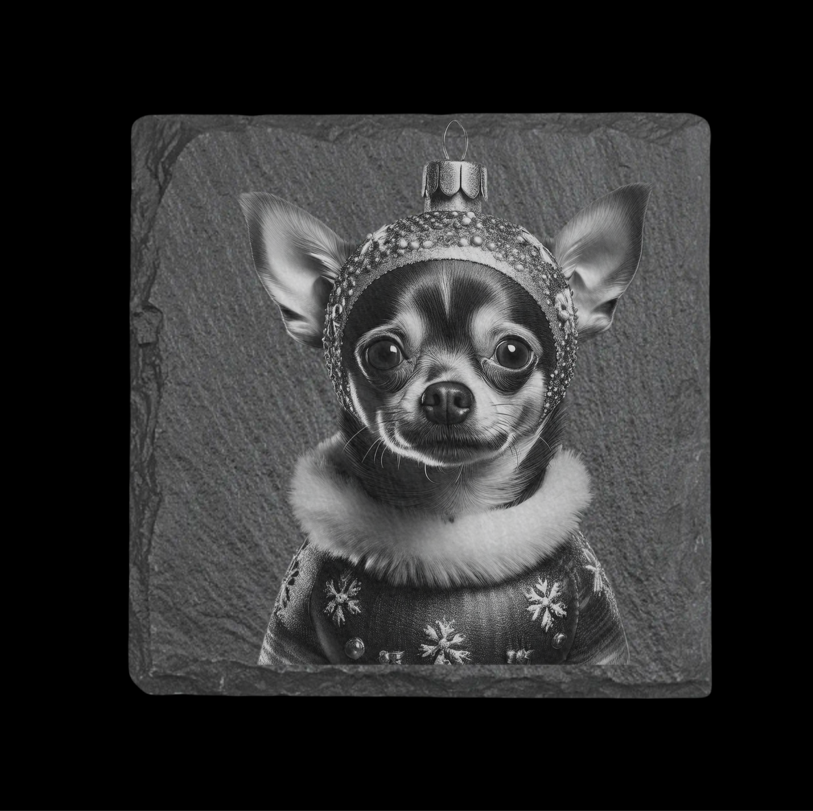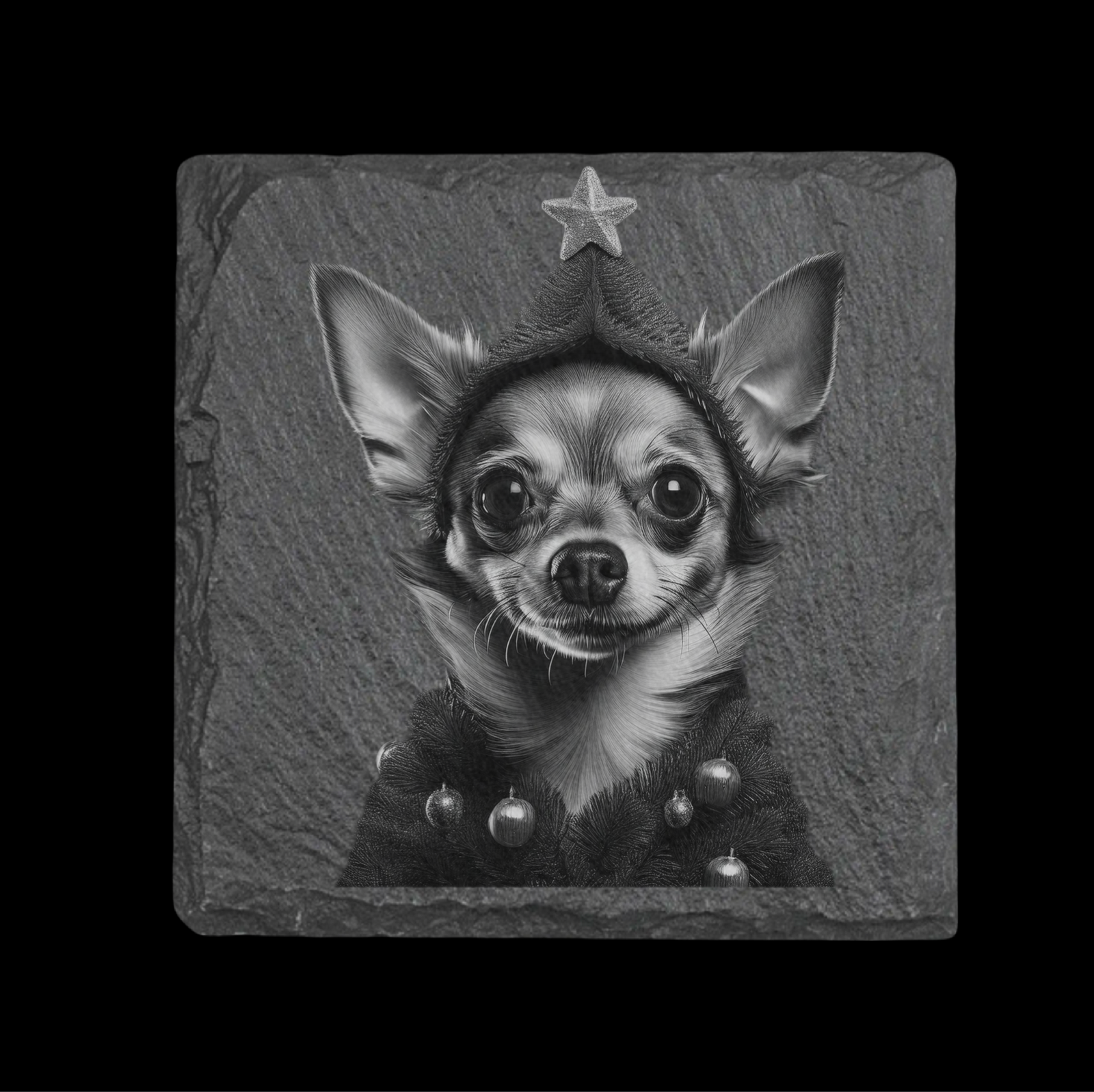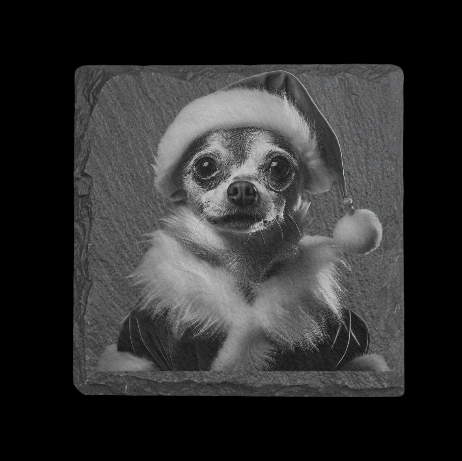 “Celebrate the season with our square slate coaster, beautifully laser-engraved with a charming Christmas Chihuahua design. A stylish and practical gift for any pet lover’s holiday table.”